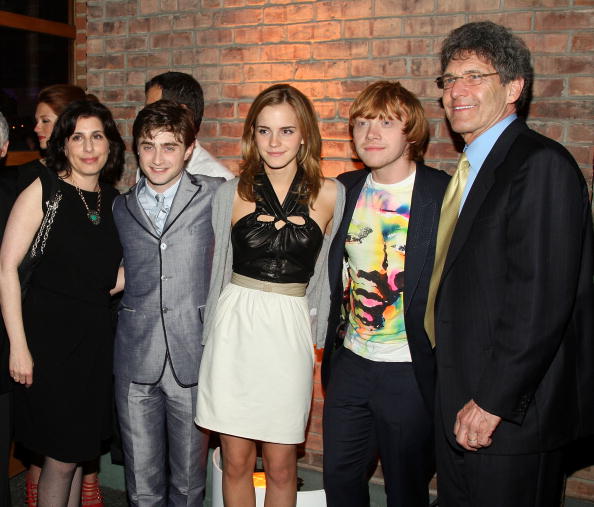 Надпись: NEW YORK - JULY 09: President of worldwide marketing for Warner Bros. Sue Kroll, actor Daniel Radcliff, actress Emma Watson, actor Rupert Grint, and president and chief operating officer for Warner Bros. Alan Horn attend the "Harry Potter and the Half Blood Prince" premiere after party at American Museum of Natural History on July 9, 2009 in New York City. (Photo by Stephen Lovekin/Getty Images)