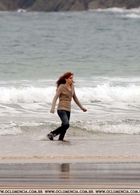 Надпись: Emma Watson who plays Hermione Granger in the Harry Potter series of films, during filming on the beach at Freshwater West in Pembrokeshire,of the seventh and final Harry Potter film (Harry Potter and the Deathly Hallows) starring Daniel Radcliffe.