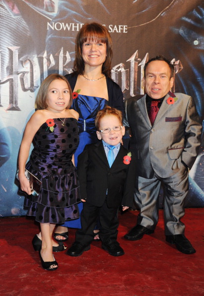 Надпись: LONDON, ENGLAND - NOVEMBER 11: (EMBARGOED FOR PUBLICATION IN UK TABLOID NEWSPAPERS UNTIL 48 HOURS AFTER CREATE DATE AND TIME. MANDATORY CREDIT PHOTO BY DAVE M. BENETT/GETTY IMAGES REQUIRED) Actor Warwick Davis (R) and his wife, Samantha Davis and their children, Annabel Davis and Harrison Davis attend the World Premiere of Harry Potter And The Deathly Hallows: Part 1 at Odeon Leicester Square on November 11, 2010 in London, England. (Photo by Dave M. Benett/Getty Images)